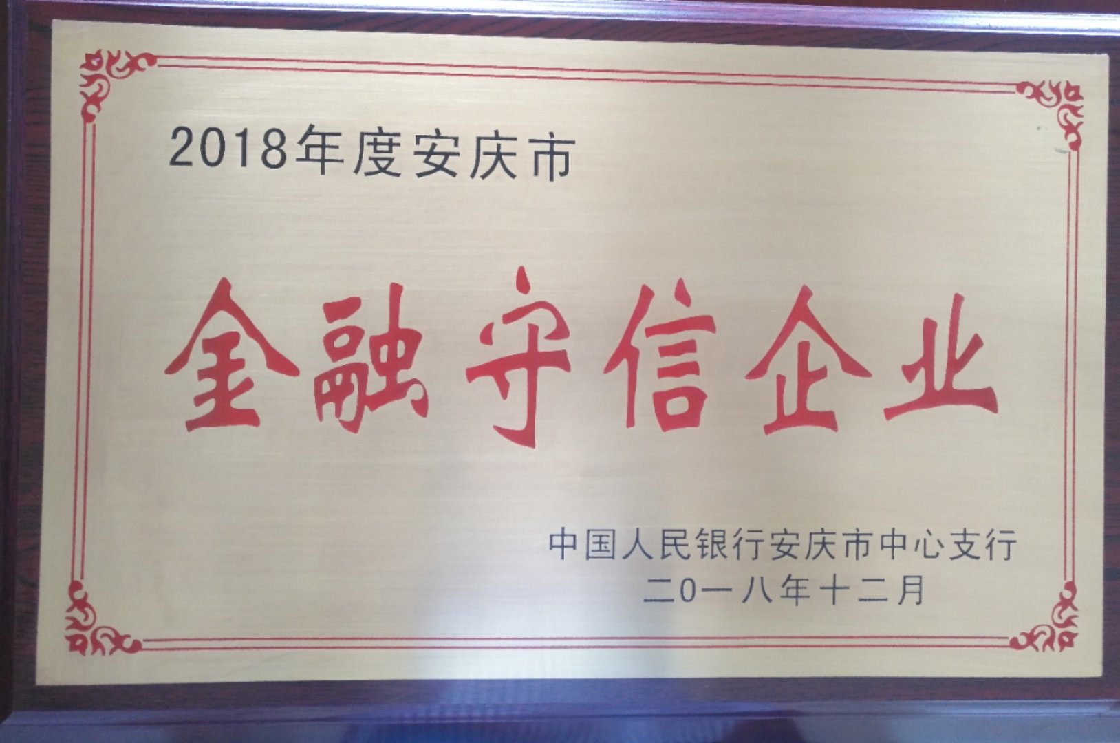 皖工榮獲2018年度安慶市金融守信企業(yè)