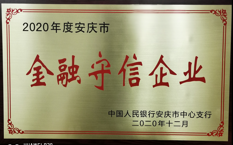 皖工榮獲2020年度安慶市“金融守信企業(yè)”榮譽稱號